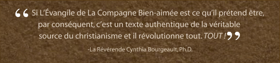 “Qu’est-ce qu’on peut dire au sujet de ce livre? Son auteur, Jehanne de Quillan, nous offre le choix. On peut le regarder comme une aberration médiévale (ou même une fraude moderne) ou l’on peut le considérer comme une transmission authentique d’une source inconnue jusqu’ici . S’il est une falsification, c’est vraiment une œuvre élégante d’une inspiration divine, qui procède directement du royaume de la « Vérité Imaginale » et en accord avec le plus grand entendement de soi de Yeshua. S’il est une falsification, l’auteur a donc réussi à nous fournir une œuvre d’exception sur la réflexion mystique et la synthèse, bien meilleur que ce qui se passe aujourd’hui pour la lecture spirituelle. Mais, si L’Évangile de la Compagne Bien-aimée est ce qu’il prétend être, alors c’est un texte authentique de la véritable source du christianisme et il révolutionne tout. TOUT!”